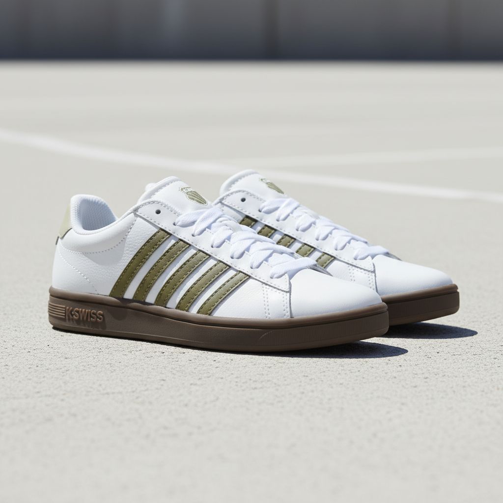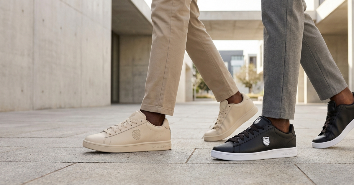 The K-SWISS TECHNA is a sleek, futuristic mid-top sneaker designed with a flat, wide outsole for superior stability and a multi-layer synthetic leather upper for optimal support.